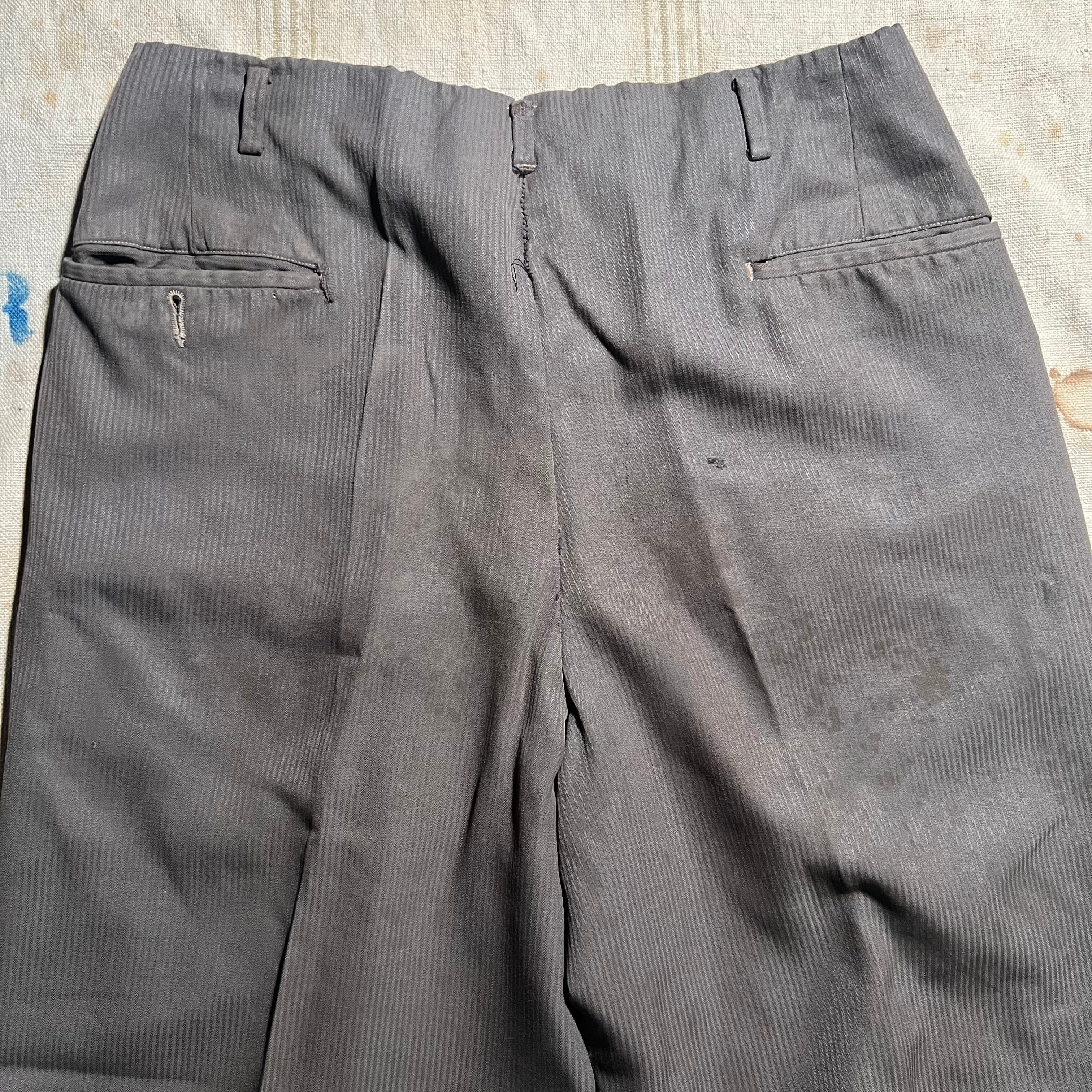 両腿・膝・ヒップに点在する多数の汚れと色むら、右ポケット周辺の大きな破れ、ステッチほつれ、左後ろポケットのボタン欠損──どれも“味”という言葉だけでは語れないリアルな使用痕。現行品では絶対に再現できない“ボロの美学”が、一本のスラックスの中で生々しく息づいています。