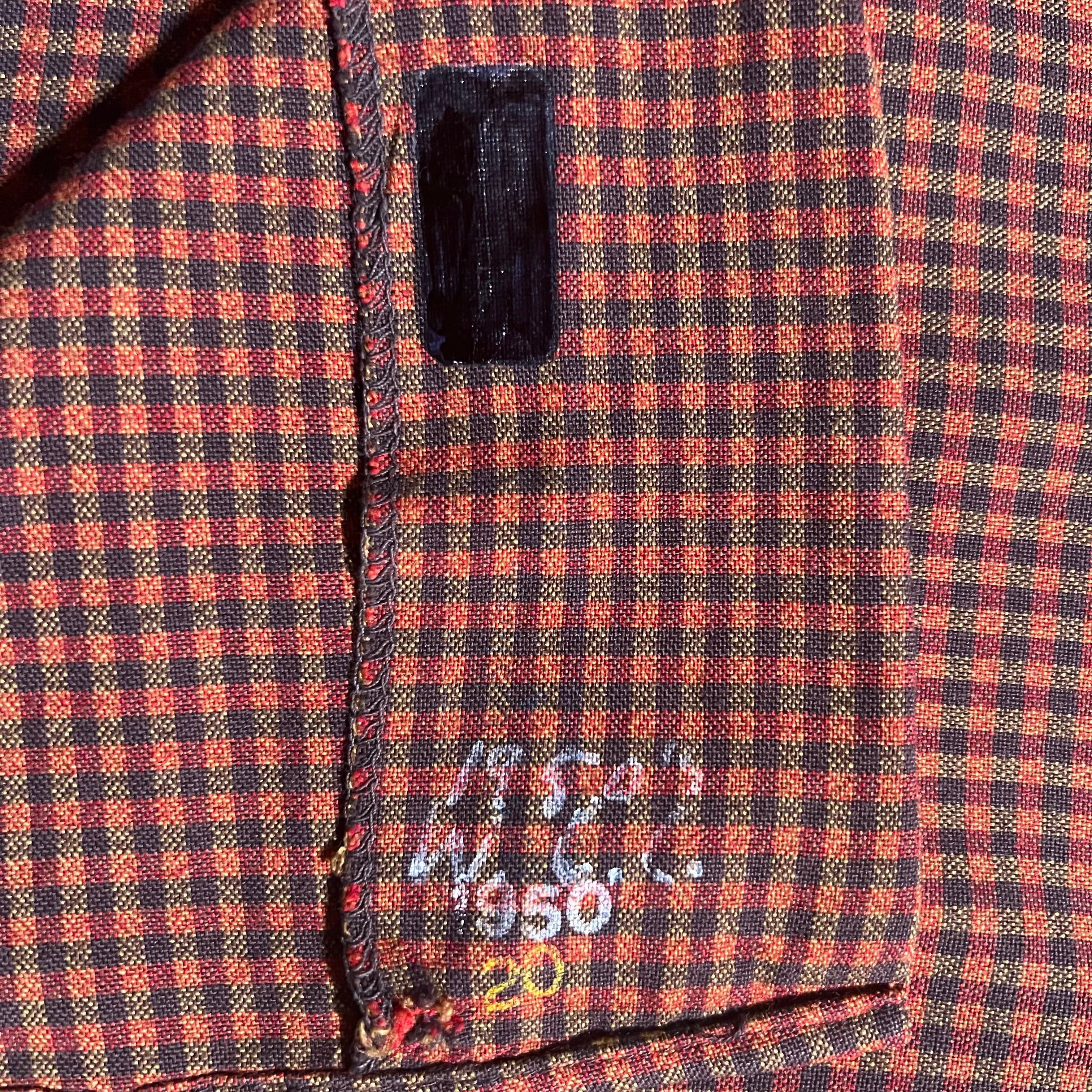 オレンジ×ブラックを基調とした細かなチェック柄は、いかにもワークとドレスの狭間にあった60年代らしい配色。派手すぎず、かといって地味にもならない、非常にバランスの取れた柄感です。